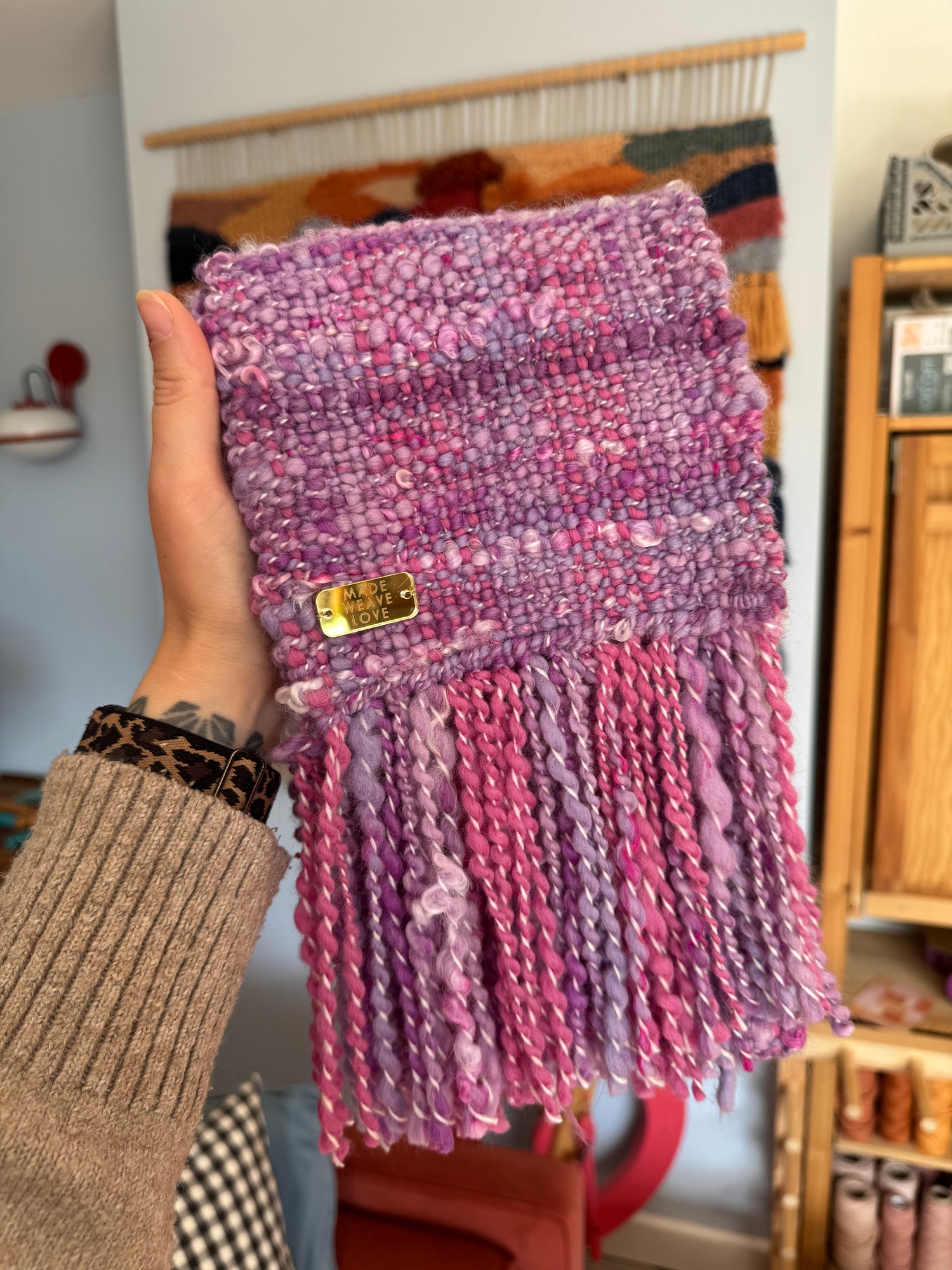 Please note: the gold tag may appear slightly blurred in photos due to iPhone camera reflections, but in person it reads clearly—“Made” / “Weave” / “Love,” with one word per line.