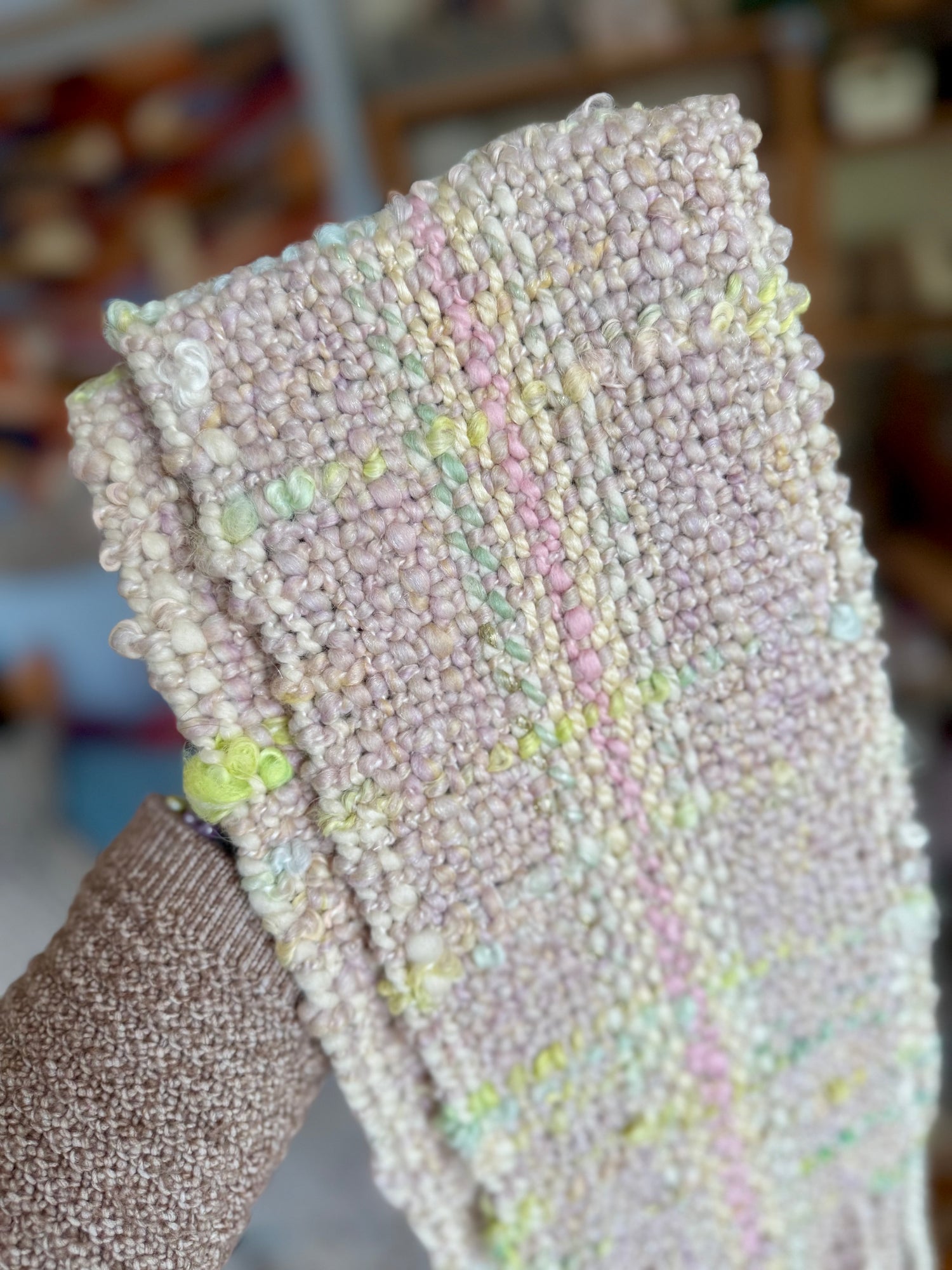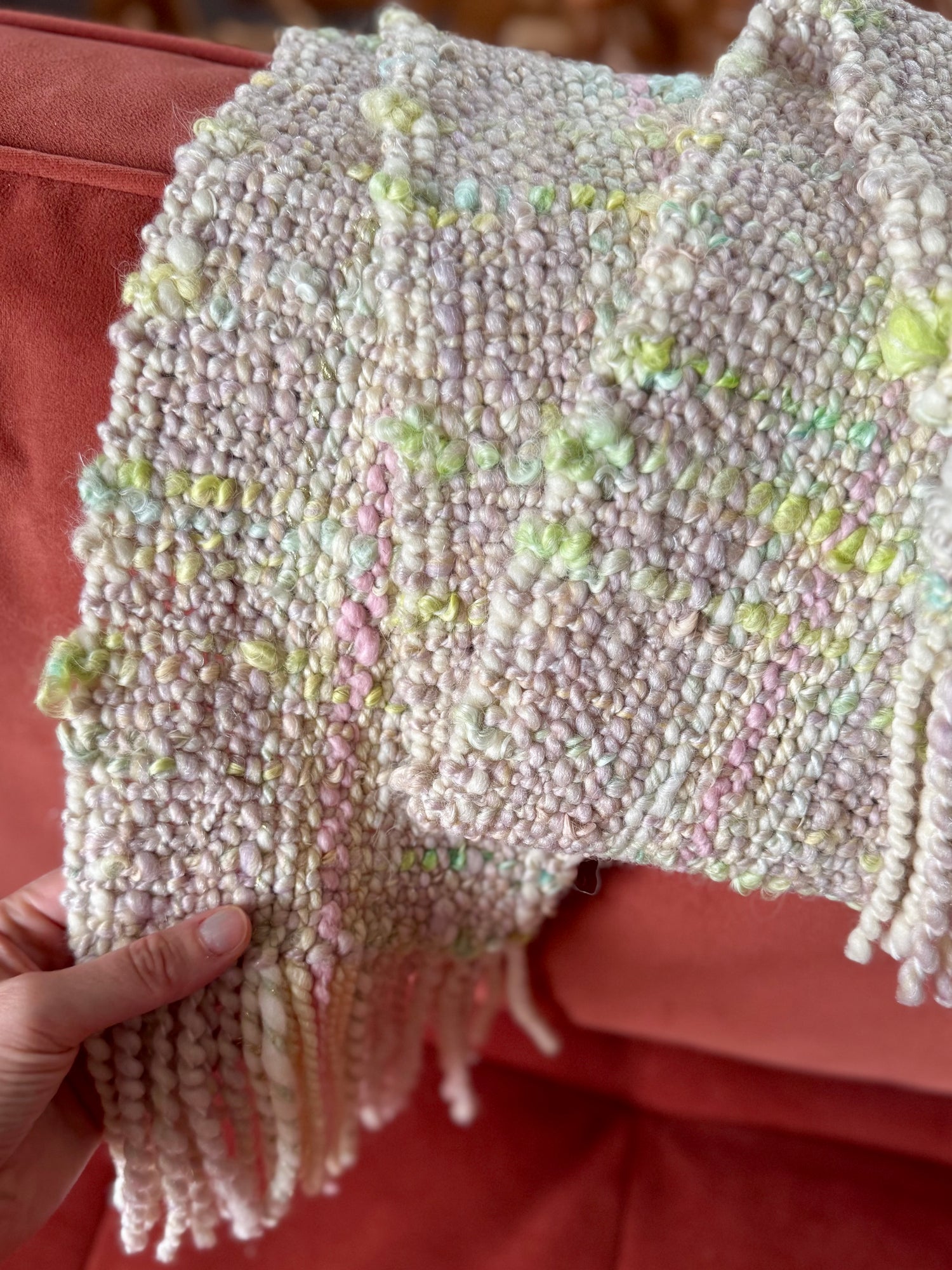 Each length is carefully hand-spun on my spinning wheel into a richly textured, chunky yarn, then expertly woven on my loom to create a truly unique piece. To finish, a golden “MadeWeaveLove” tag is hand-stitched on, adding a final touch of distinction. Your scarf will arrive safely tucked inside a branded cotton storage bag, ready to be treasured.