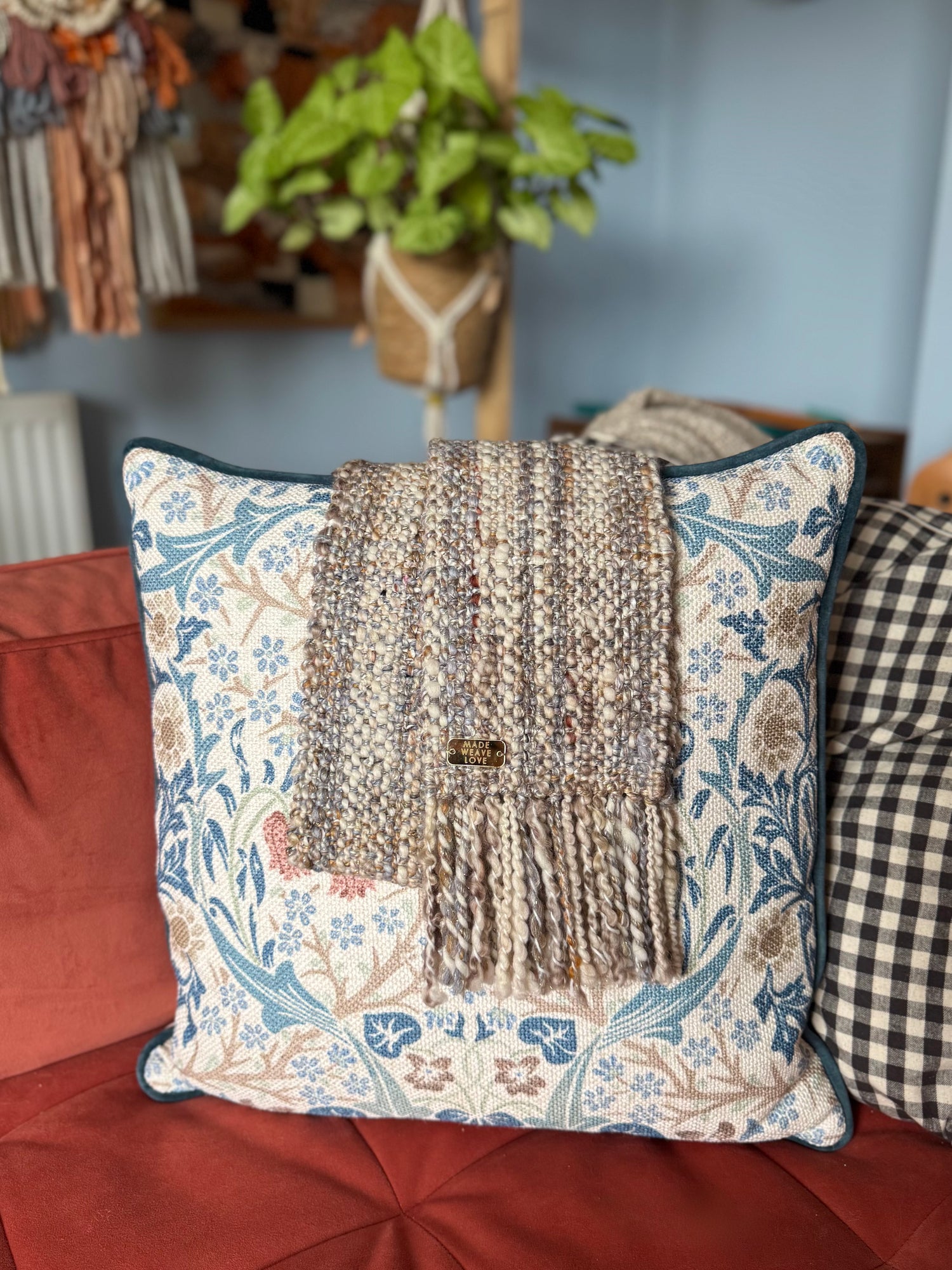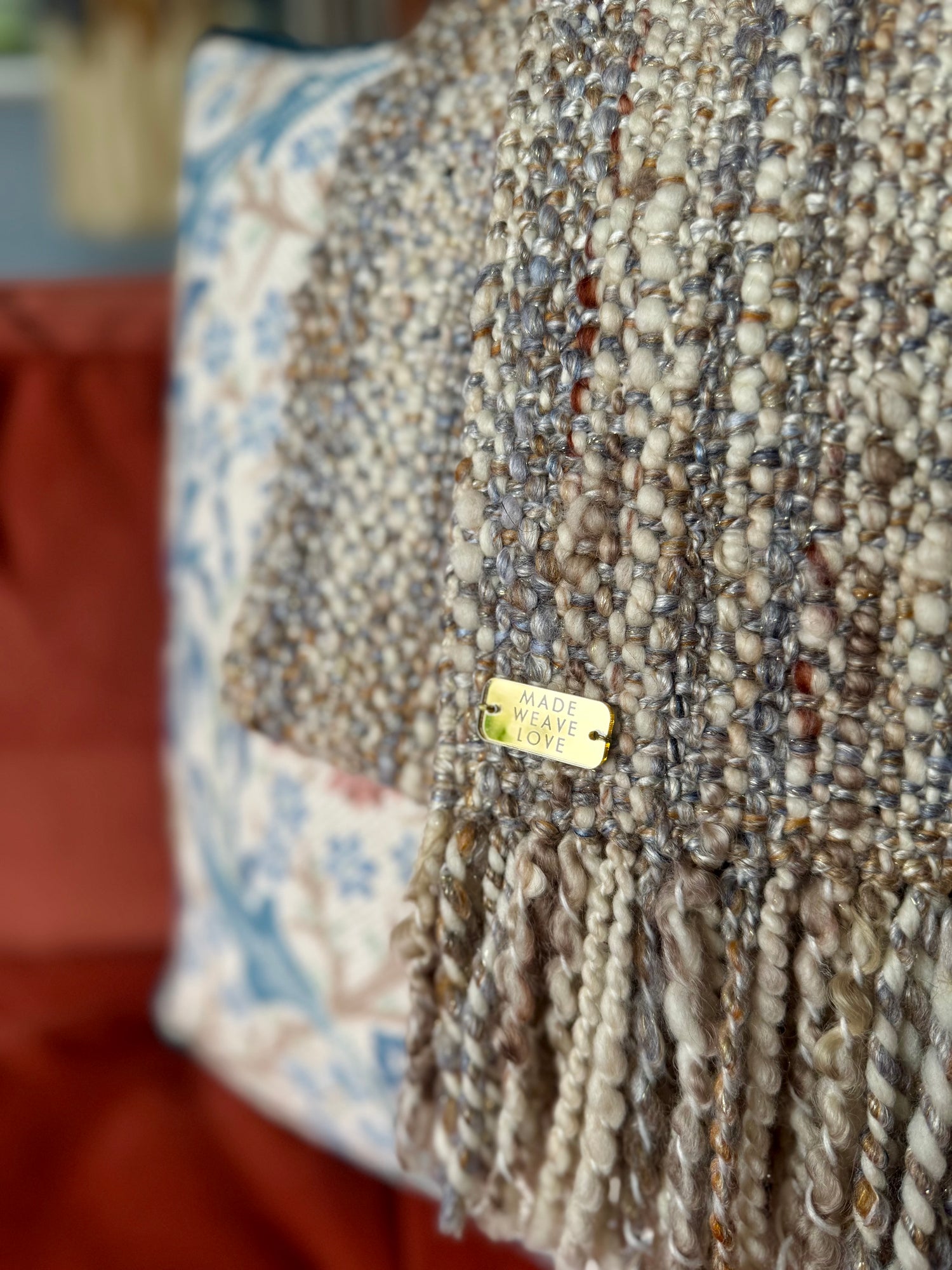 Each length is carefully hand-spun on my spinning wheel into a richly textured, chunky yarn, then expertly woven on my loom to create a truly unique piece. To finish, a golden “MadeWeaveLove” tag is hand-stitched on, adding a final touch of distinction. Your scarf will arrive safely tucked inside a branded cotton storage bag, ready to be treasured.